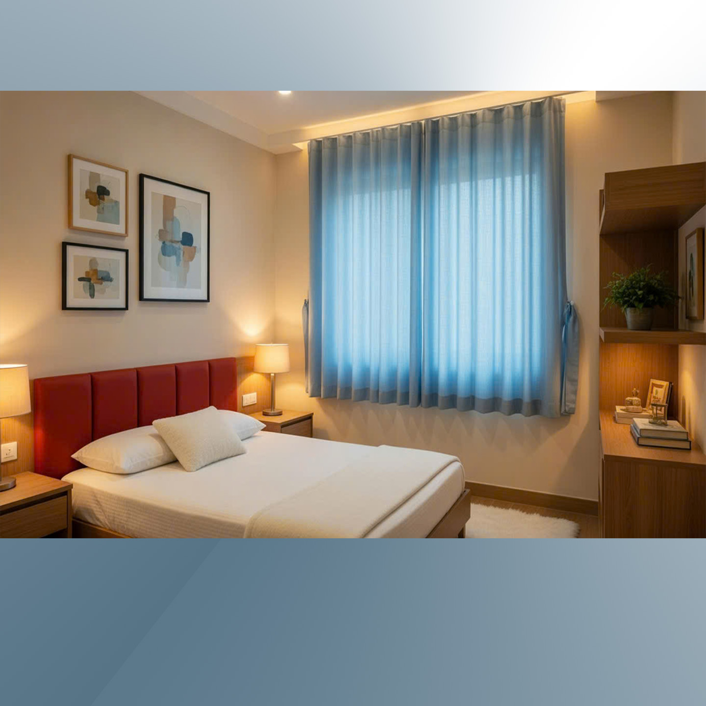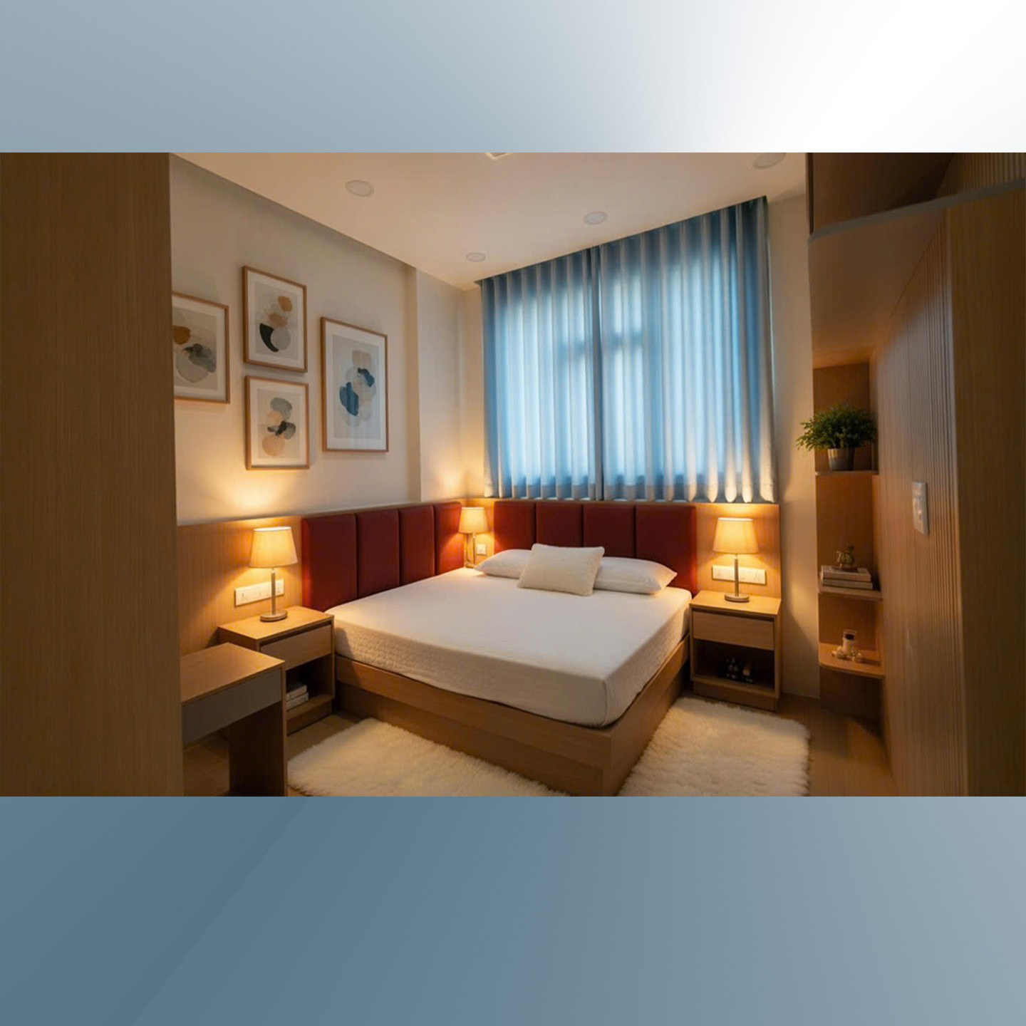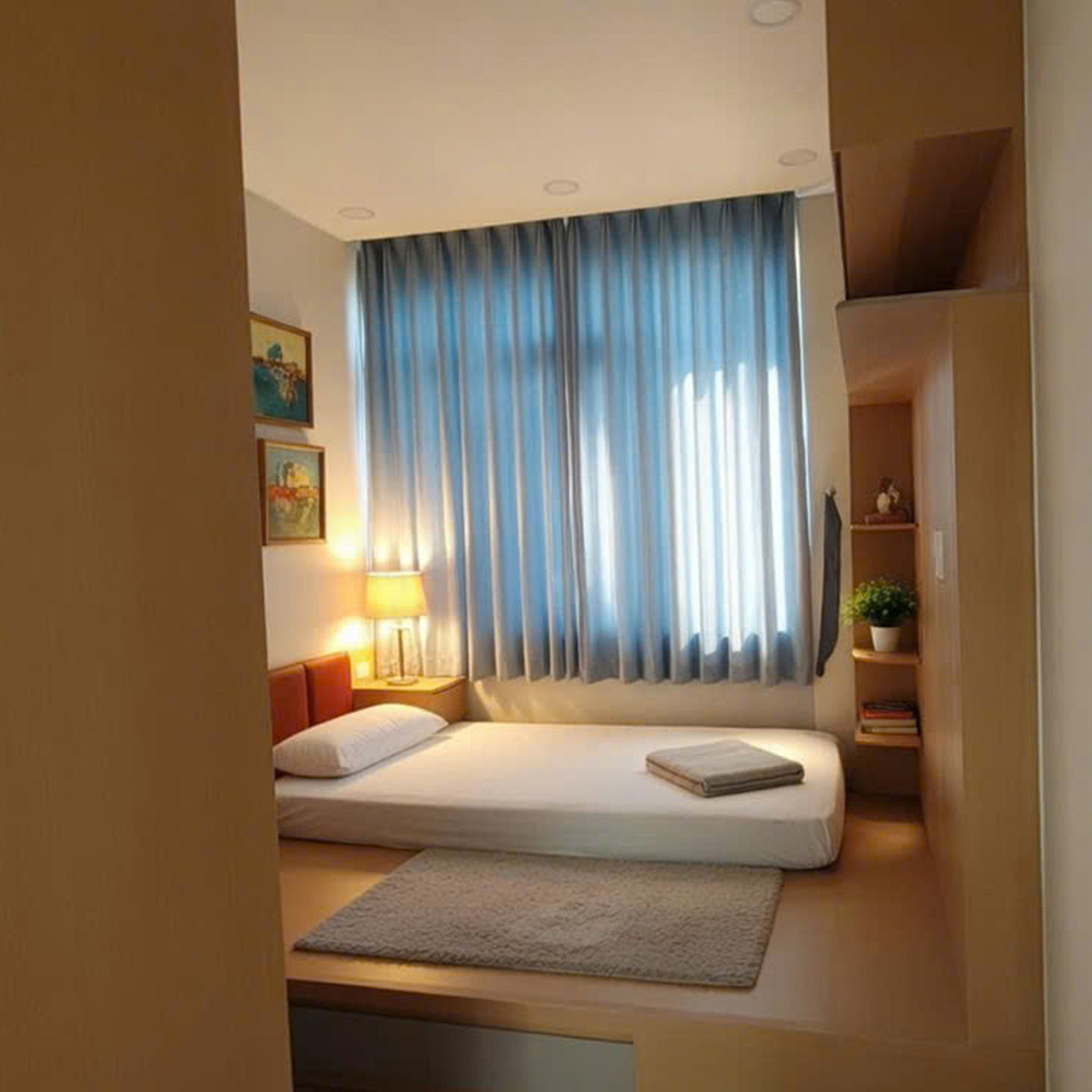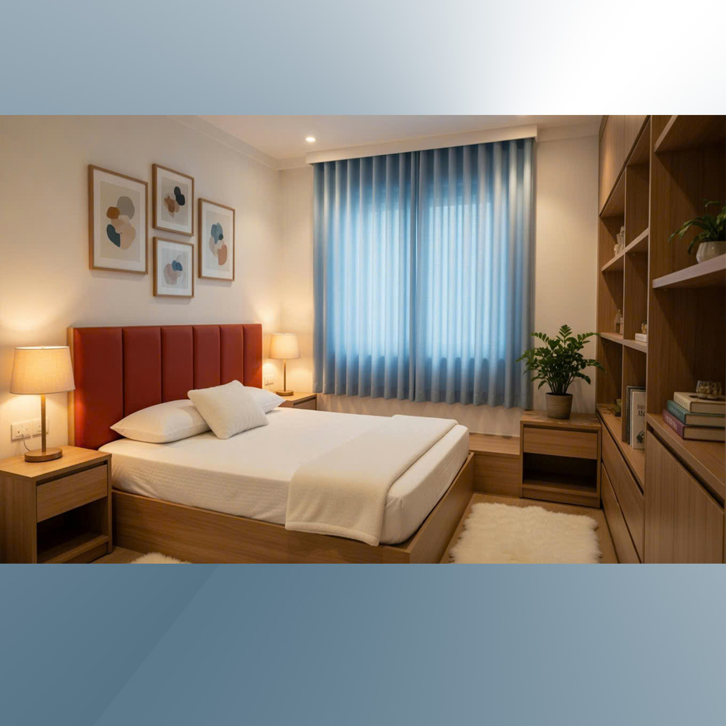 Phòng ngủ ấm cúng: Với tone màu xanh dịu mắt phối cùng nội thất gỗ 🪵, rèm cửa chính là “vệ sĩ” canh giữ giấc ngủ ngon cho cả gia đình. 😴💤