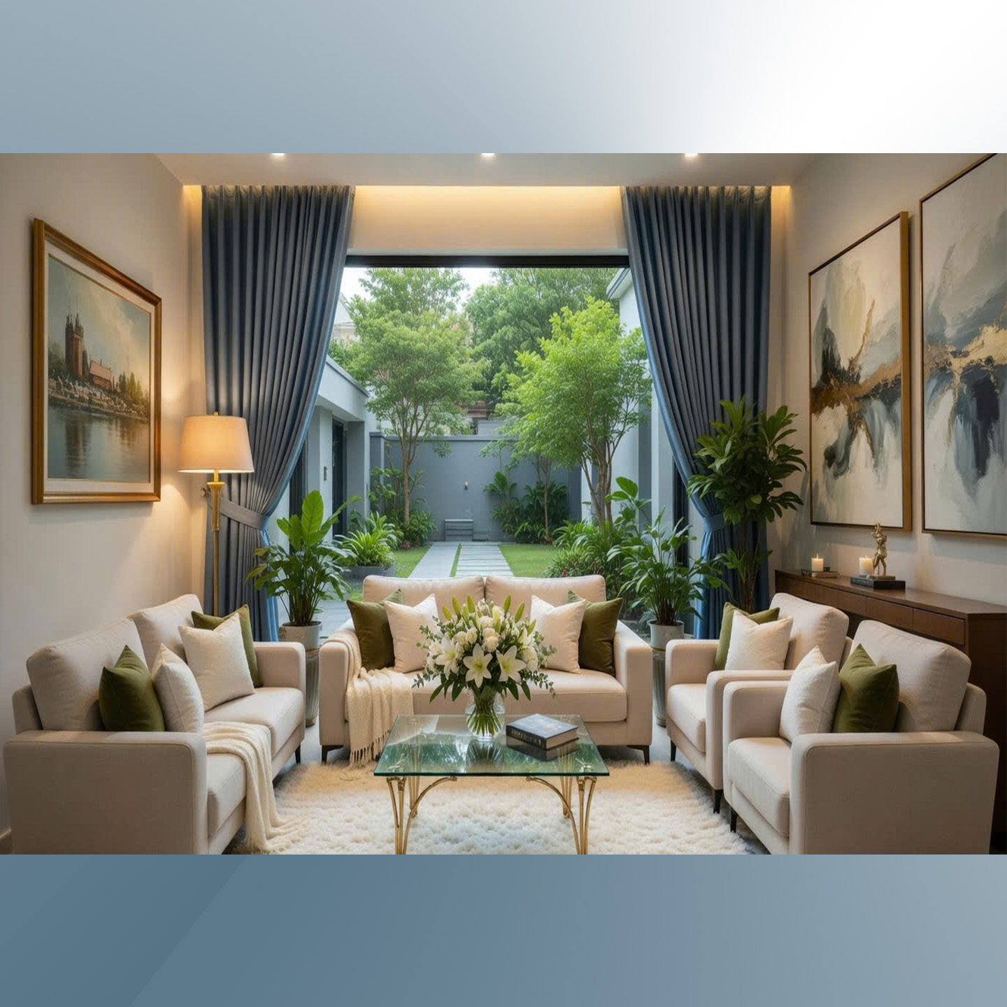 Phòng khách sang trọng: Rèm kịch trần giúp ăn gian chiều cao căn phòng 📏, kết hợp view sân vườn xanh mát tạo cảm giác thư thái vô cùng. 🍃